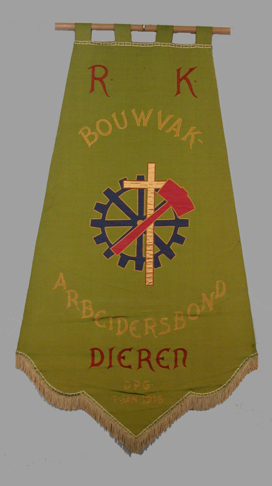 Groen vaandel met blauw rad, gouden kruis, rode hamer, Katholieke Arbeidersbond Dieren opg. 1 jan. 1918