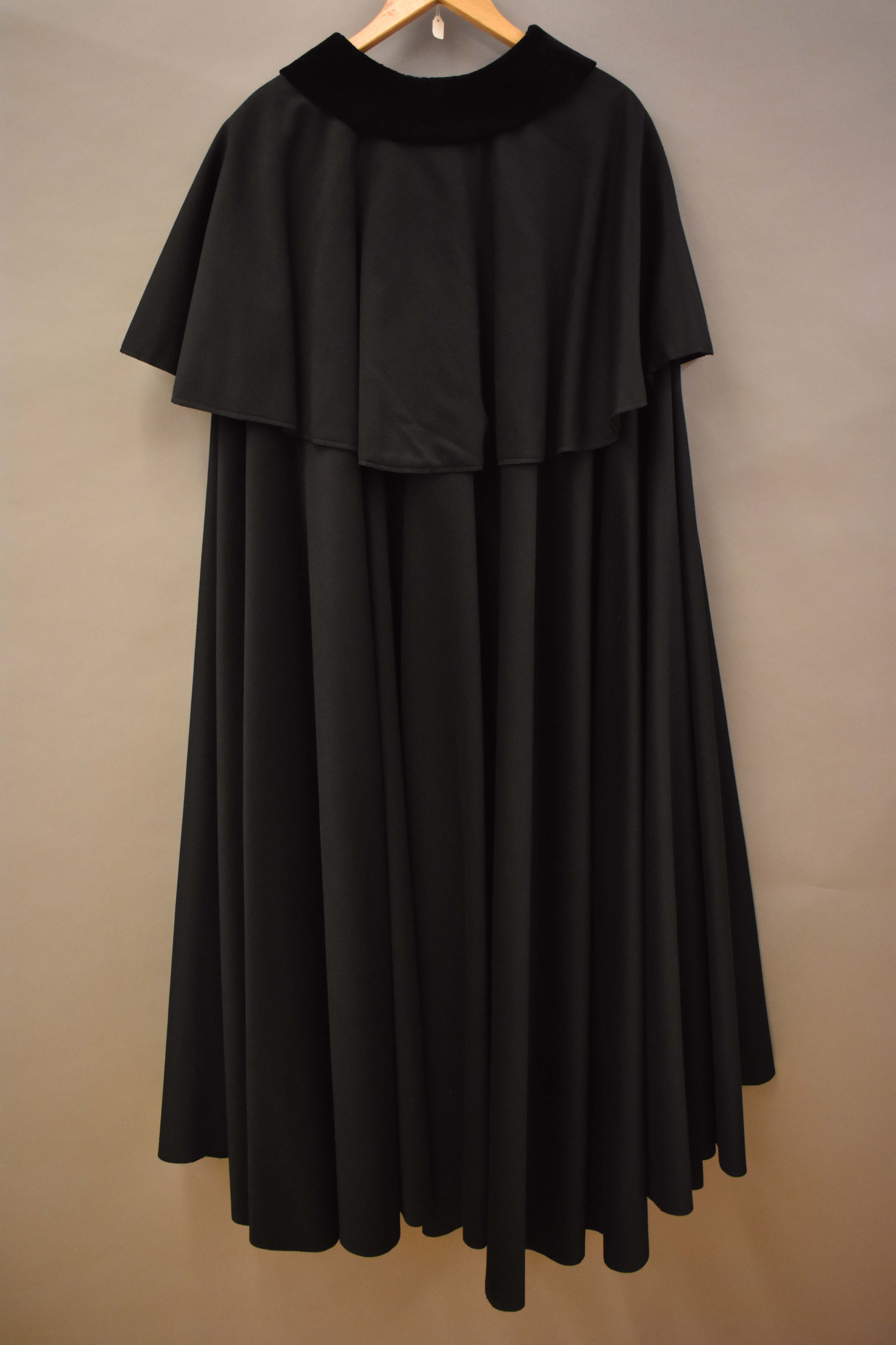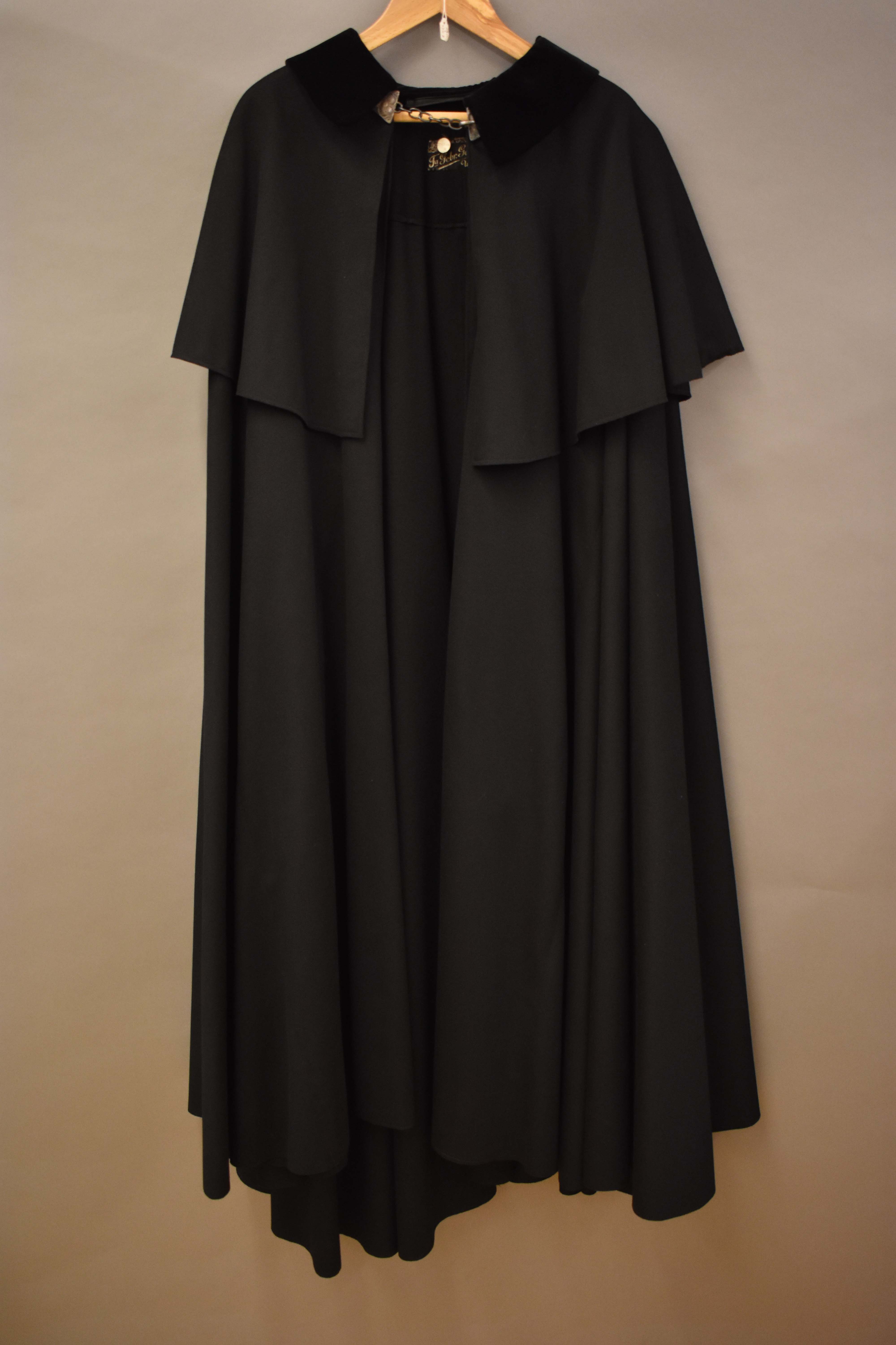 Zwarte wintermantel (alma viva) met pelerine en kraag en metalen sluiting, van Mgr. Dr. Geerdinck