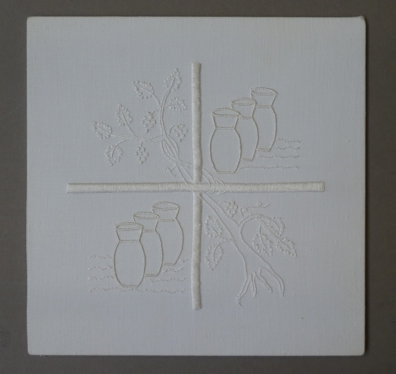 Witte palla met kruis met wijnranken en zes vaten