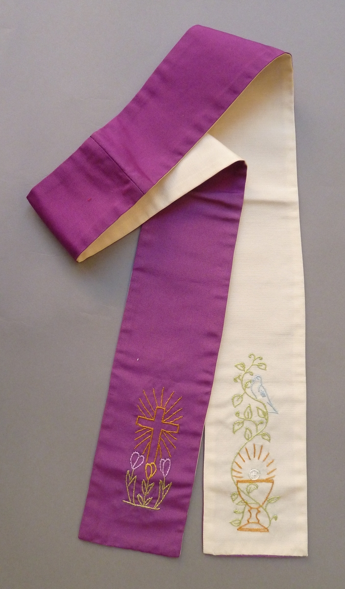 Bedienings- en doopstola in wit en paars, geborduurd met kruis en kelk met duif