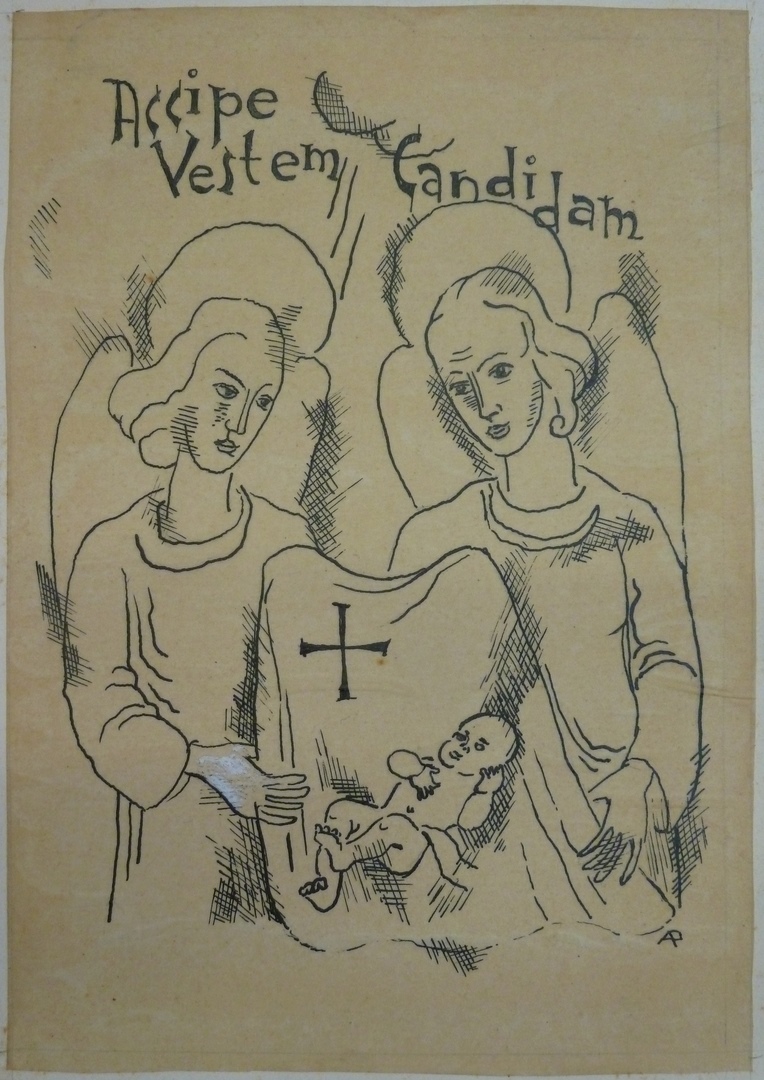 Ontwerp doopplaatje met twee engelen met doek waarop het Christuskind