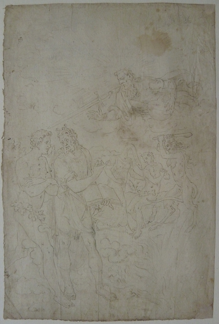 Mozes, met de Wet als opengeslagen boek in zijn handen, wijst de Mens op God als rechter. God de Vader verschijnt met en rijksappel in de linkerhand en een tweesnijdend zwaard uit zijn mond, dat zowel Gods Woord als zijn oordeel over goed en kwaad symboliseert. Op de rechtervoorgrond het vuur van de hel. Op ...