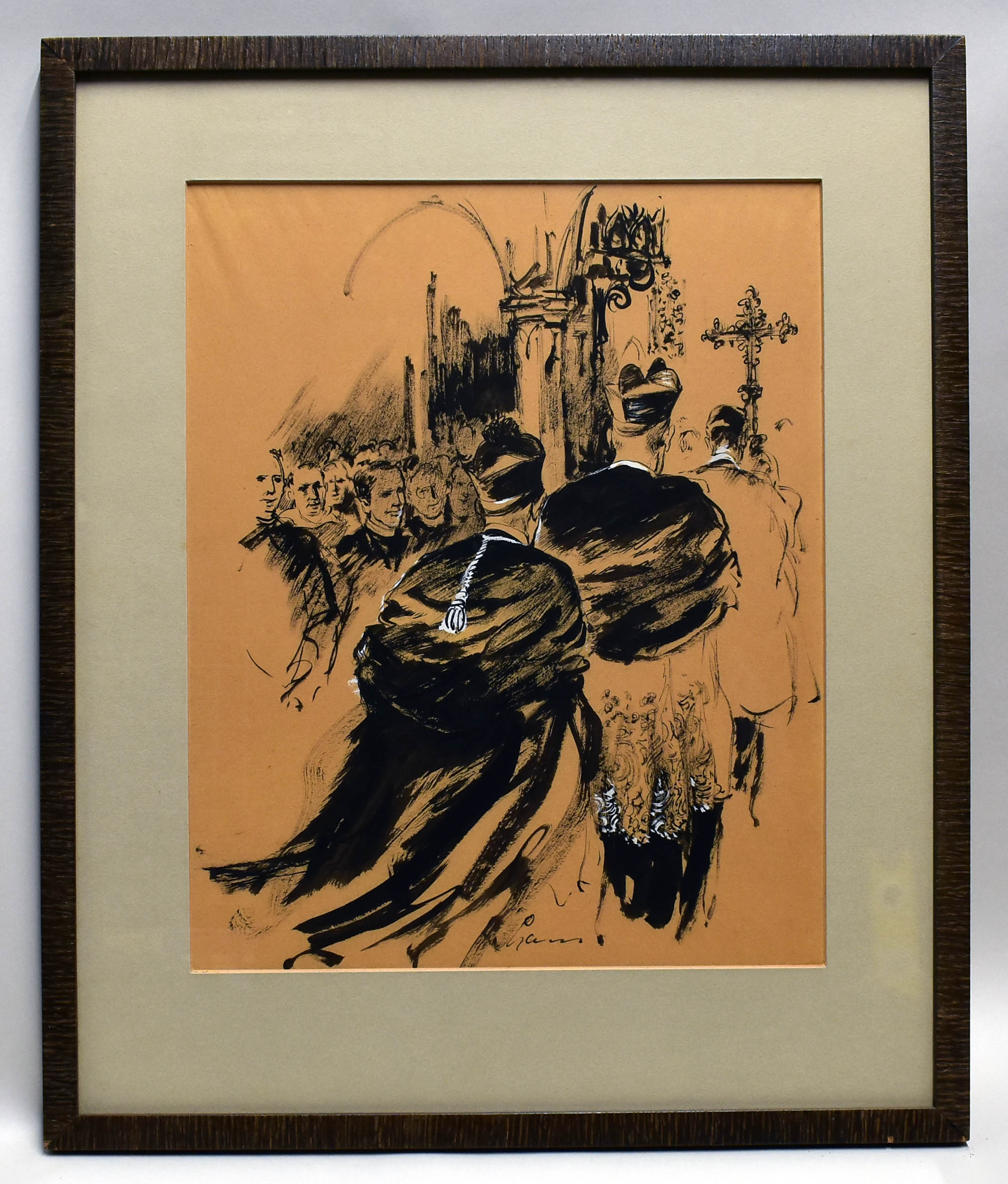 Stoet met kardinaal Johannes de Jong en bisschop Bernardus Johannes Alfrink in Catharinakerk (Utrecht) gezien van achteren