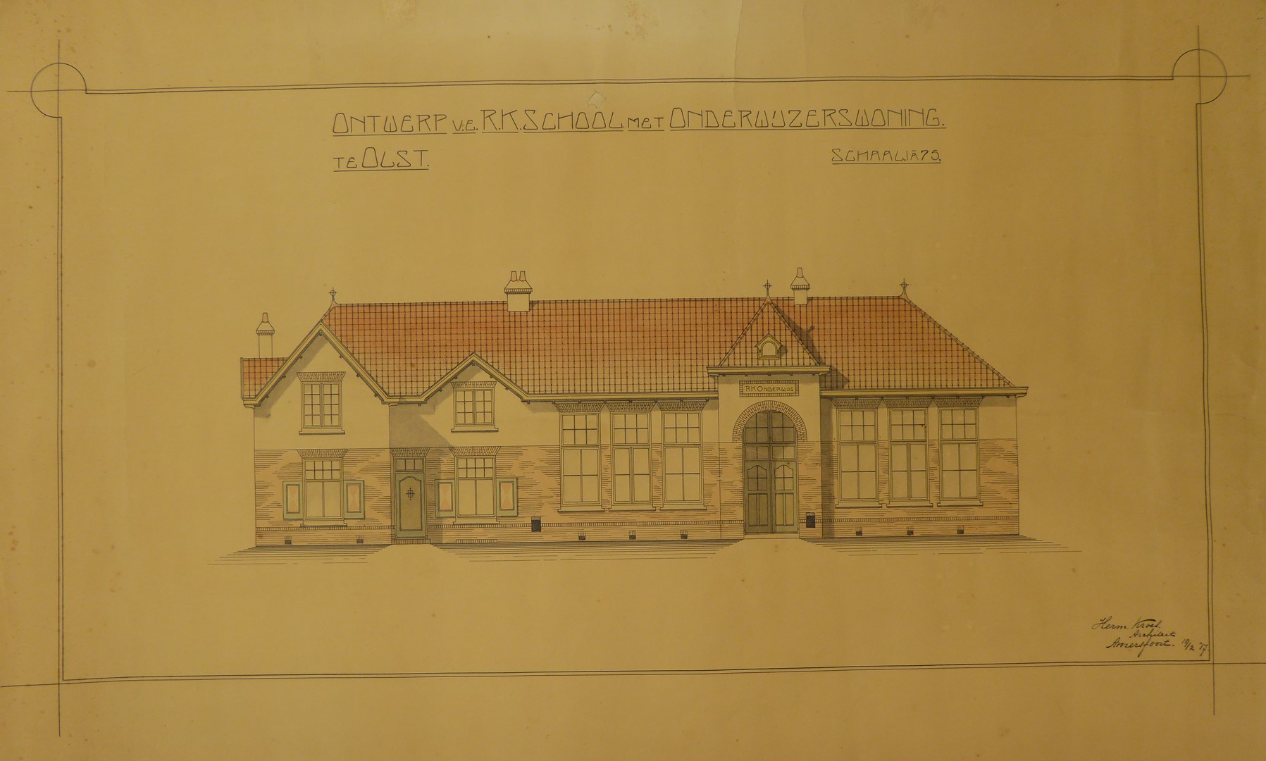 Ontwerptekening voor R.K. school met onderwijzerswoning te Olst, schaal 1 op 75