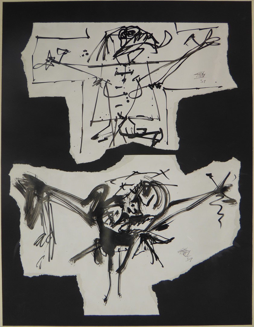 Kruisiging van Christus onder afgebeeld, boven van de goede moordenaar, op gescheurd papier