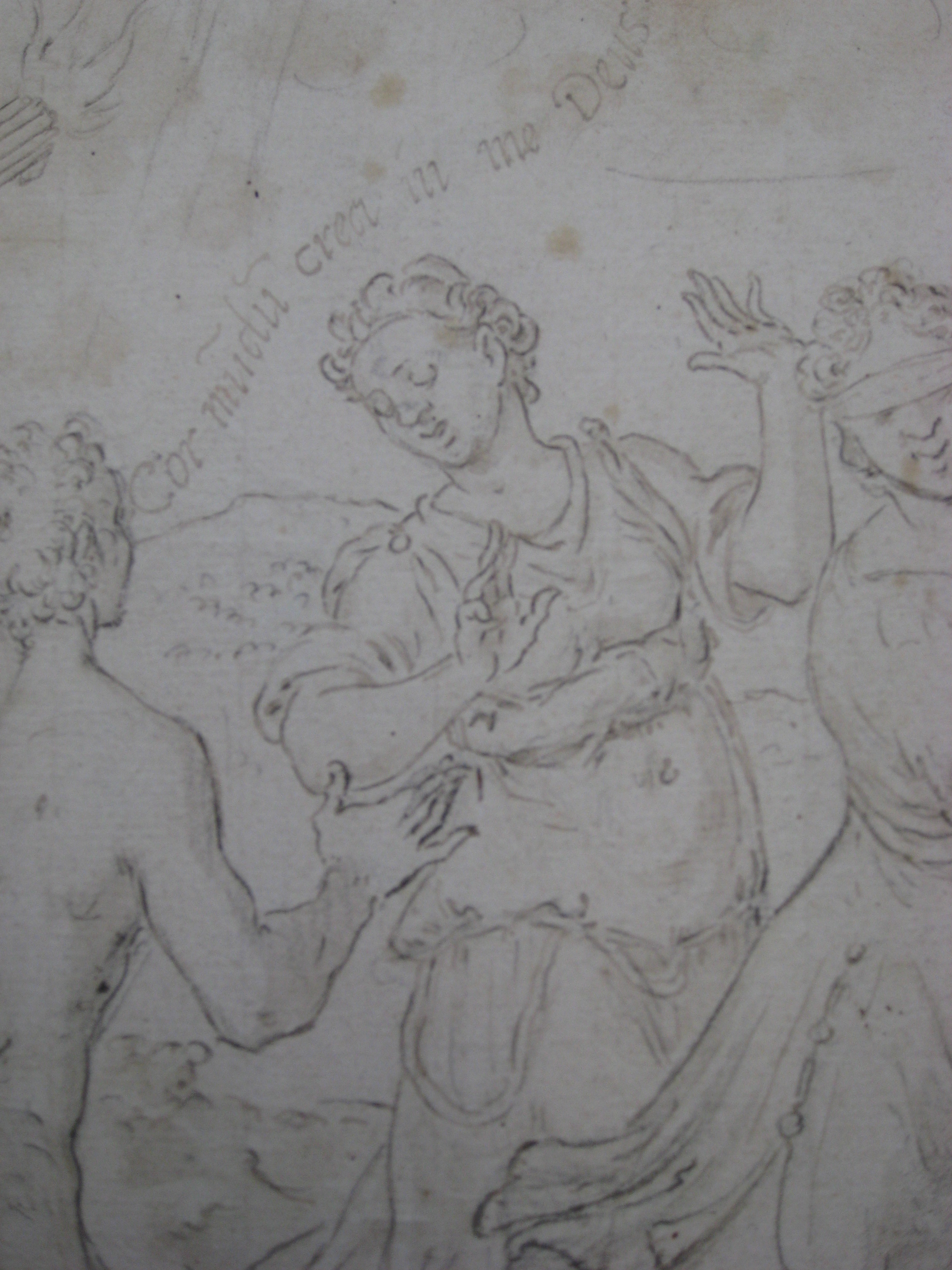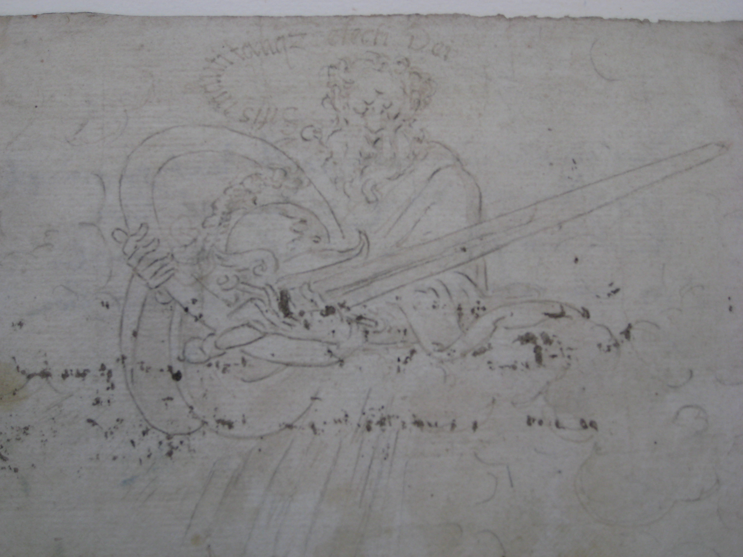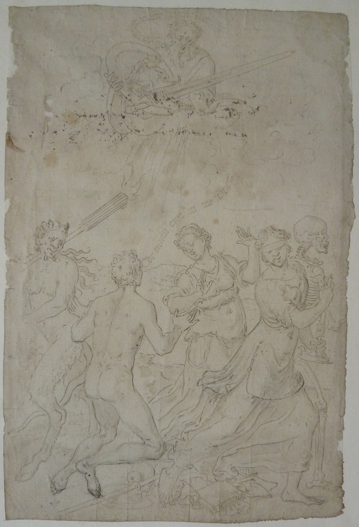 De Mens knielt voor God de Vader die hem de christelijke wapenrusting van helm, zwaard en schild aanbiedt. De Mens heeft zijn pelgrimsmantel, staf, hoed en waterfles afgelegd, als symbool van het goede verdienen met eigen vermogen of kracht. De personificaties van Vertwijfeling (links), blind Vernuft en de Dood vluchten van hem weg, net als ...