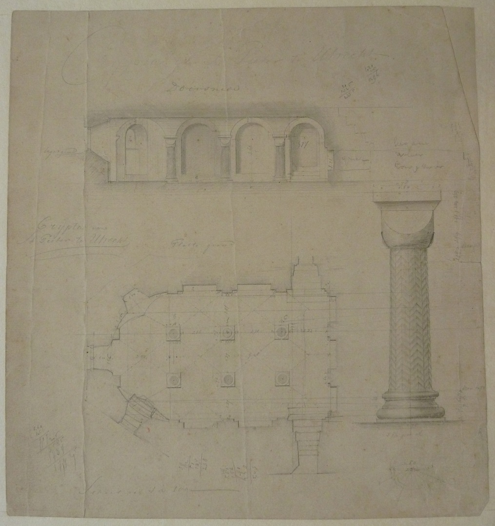 Doorsnede, plattegrond en aanzicht van een pilaar van de crypte van de St. Pieter te Utrecht