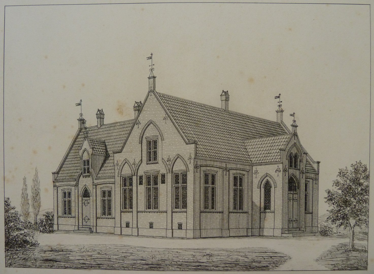 Ontwerp voor school, een aanzicht op voor- en zijkant
