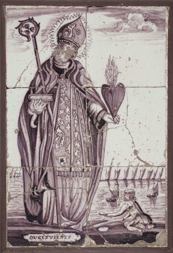 Tegeltableau in mangaankleurig aardewerk met St. Augustinus aan het strand (in lijst)