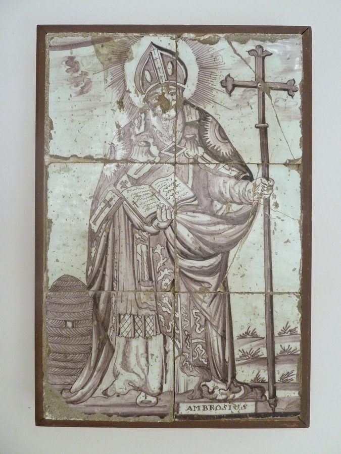 Tegeltableau in mangaankleurig aardewerk met St. Ambrosius (in lijst)