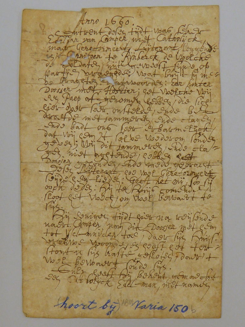 Document bij ABM v150a met "Anno 1660 ... niet Catholijck maar Gereformeert Luijtenant ..."