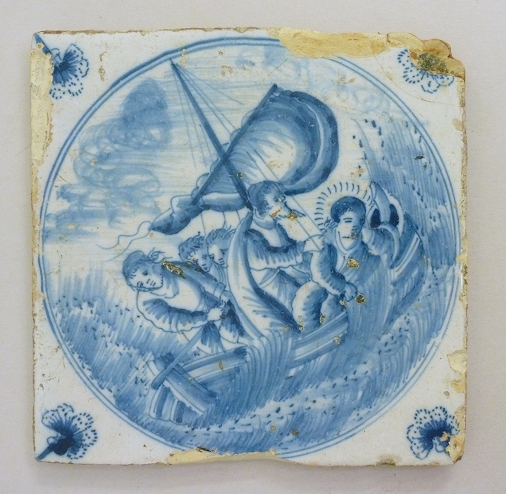 Tegel in blauw met voorstelling van de storm op het meer van Genezareth
