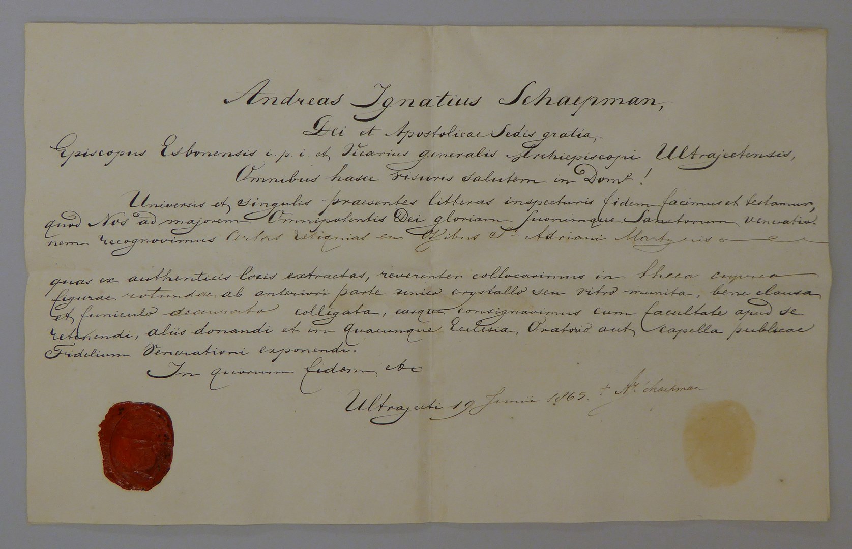 Echtheidsverklaring bij reliek van H. Adrianus getekend door A.I. Schaepman