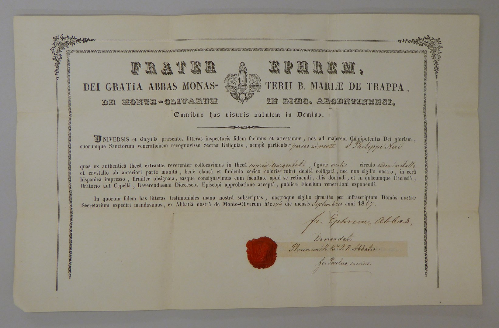 Echtheidsverklaring bij reliek van H. Philippus Nerius