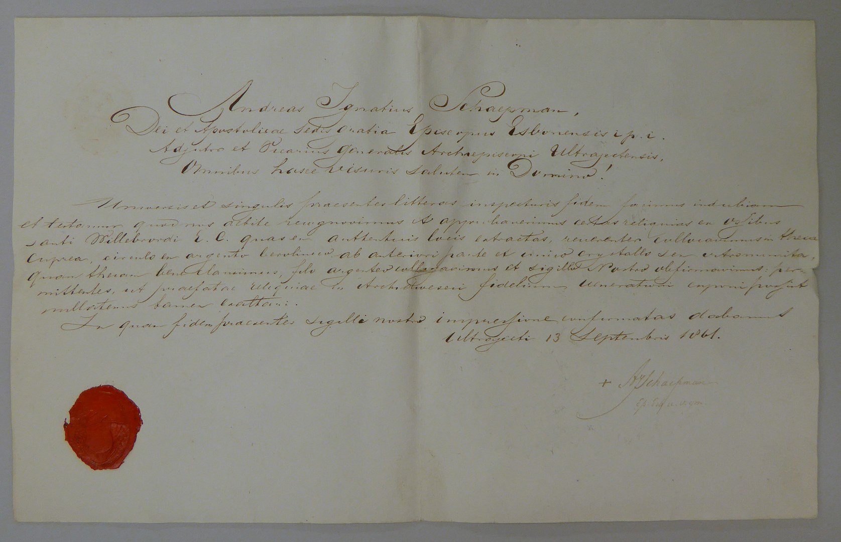Echtheidsverklaring bij reliek van H. Willibrordus, getekend door A.I. Schaepman