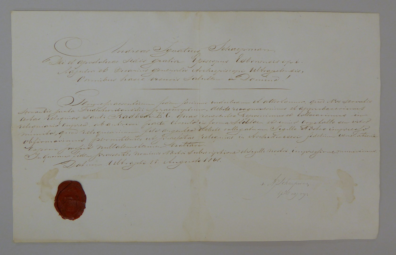 Echtheidsverklaring bij reliek van H. Radboud getekend door A.I. Schaepman
