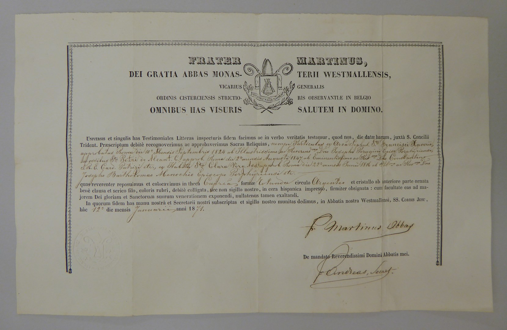 Echtheidsverklaring bij relieken van HH. Franciscus Xaverius, Petrus van Alcantara en Clara