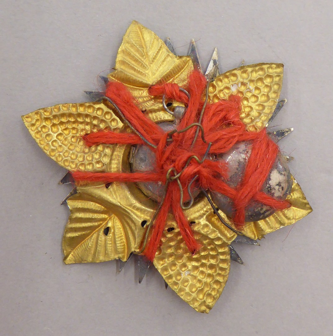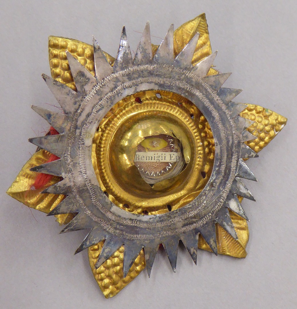 Reliekmedaillon met koperen blaadjes en stralenkrans met reliek van H. Remigius