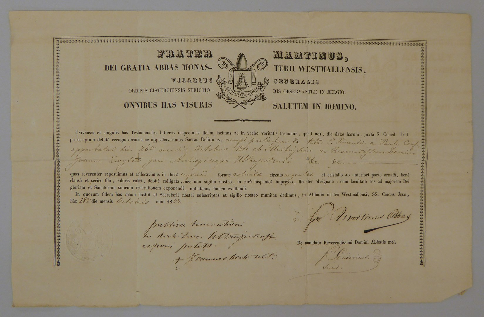 Echtheidsverklaring bij reliek van H. Vincentius a Paolo