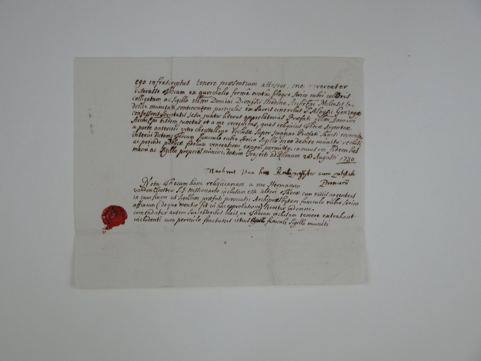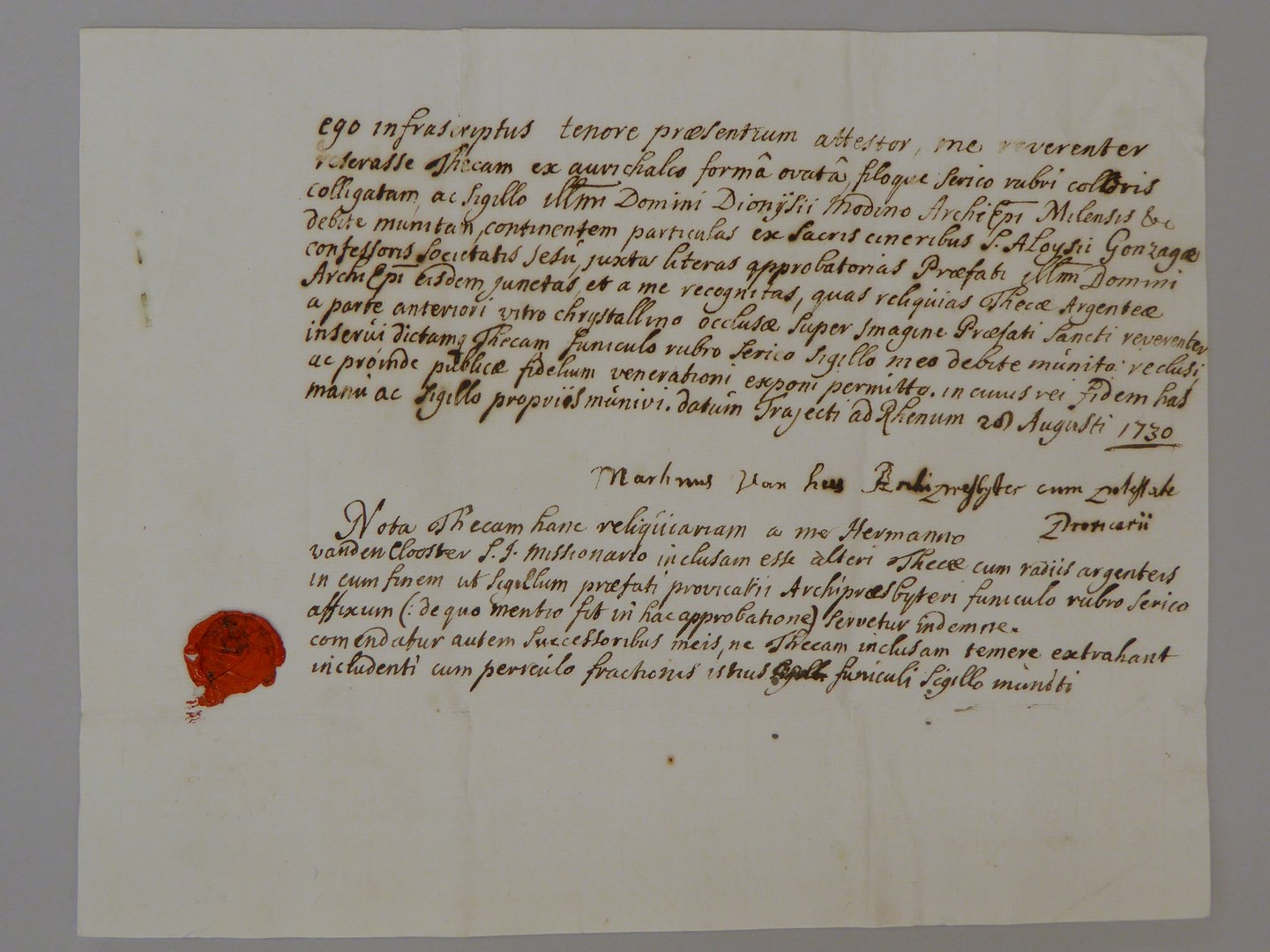Echtheidsverklaring bij ABM m1537a, reliek van H. Aloysius van Gonzaga, door Martinus van Hees