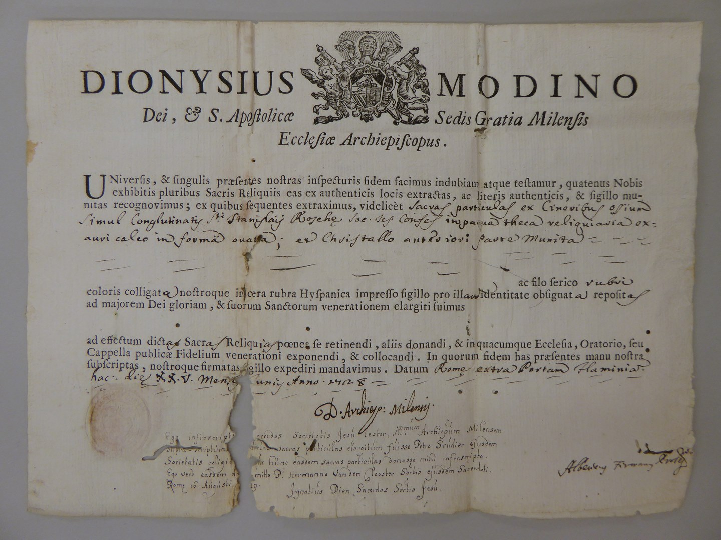 Echtheidsverklaring bij reliek van H. Stanislaus Kostka met "Dionysius Modino ..."