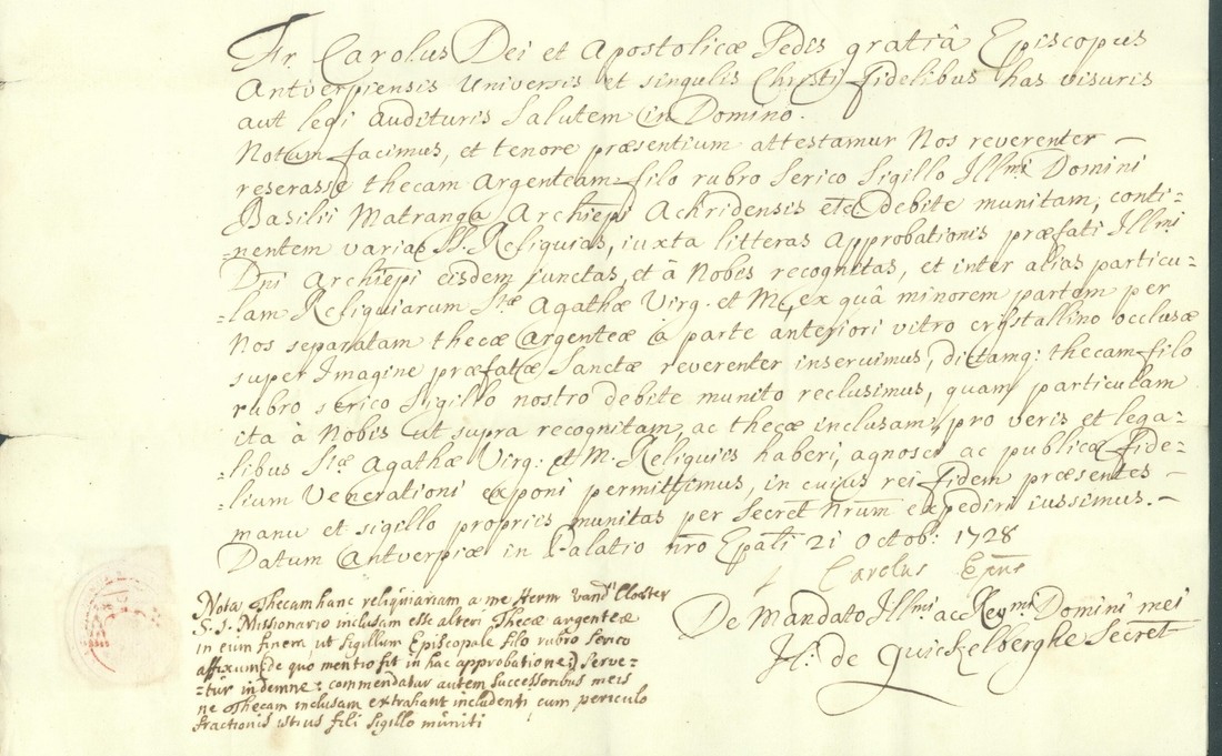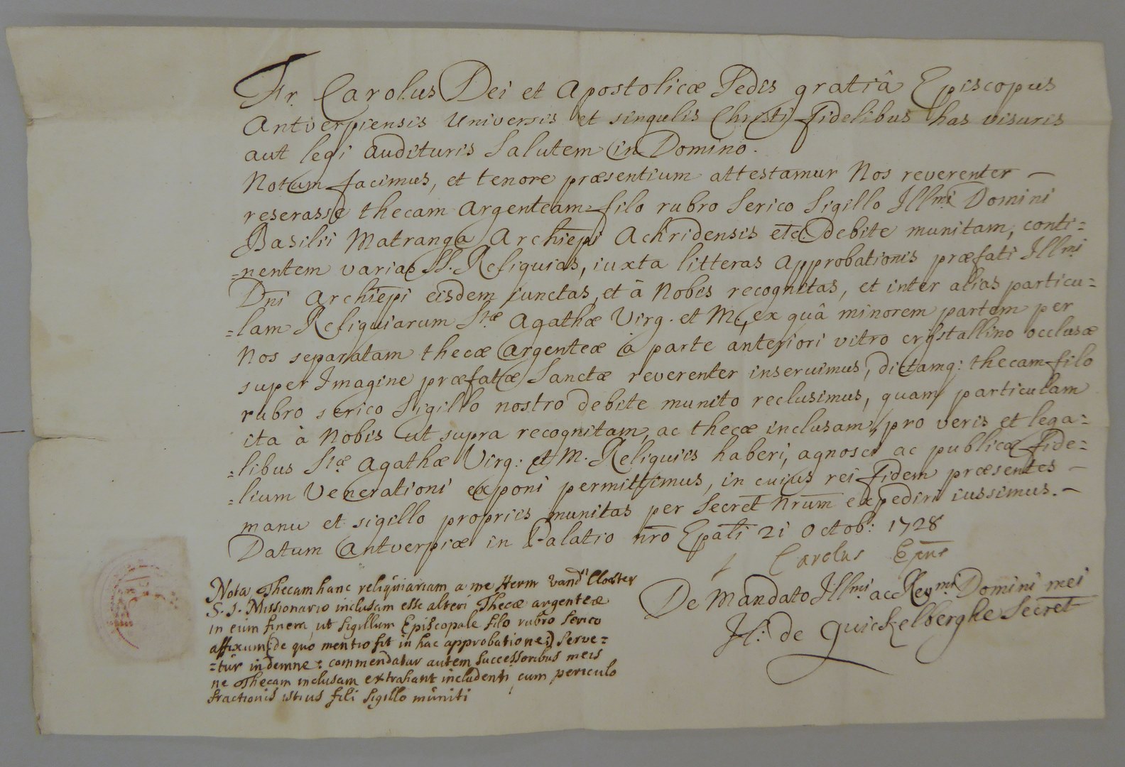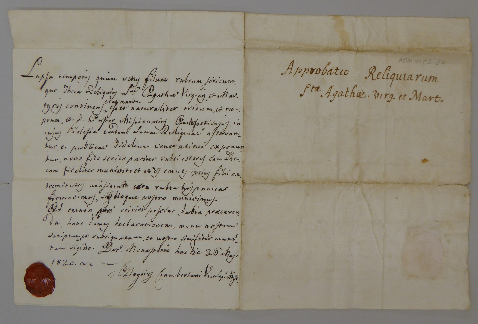 Echtheidsverklaring bij ABM m1538, reliek van H. Agatha