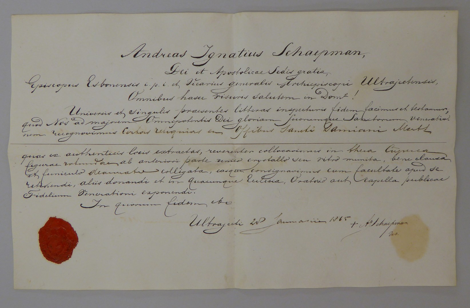 Echtheidsverklaring bij reliek van H. Damianus, getekend door A.I. Schaepman
