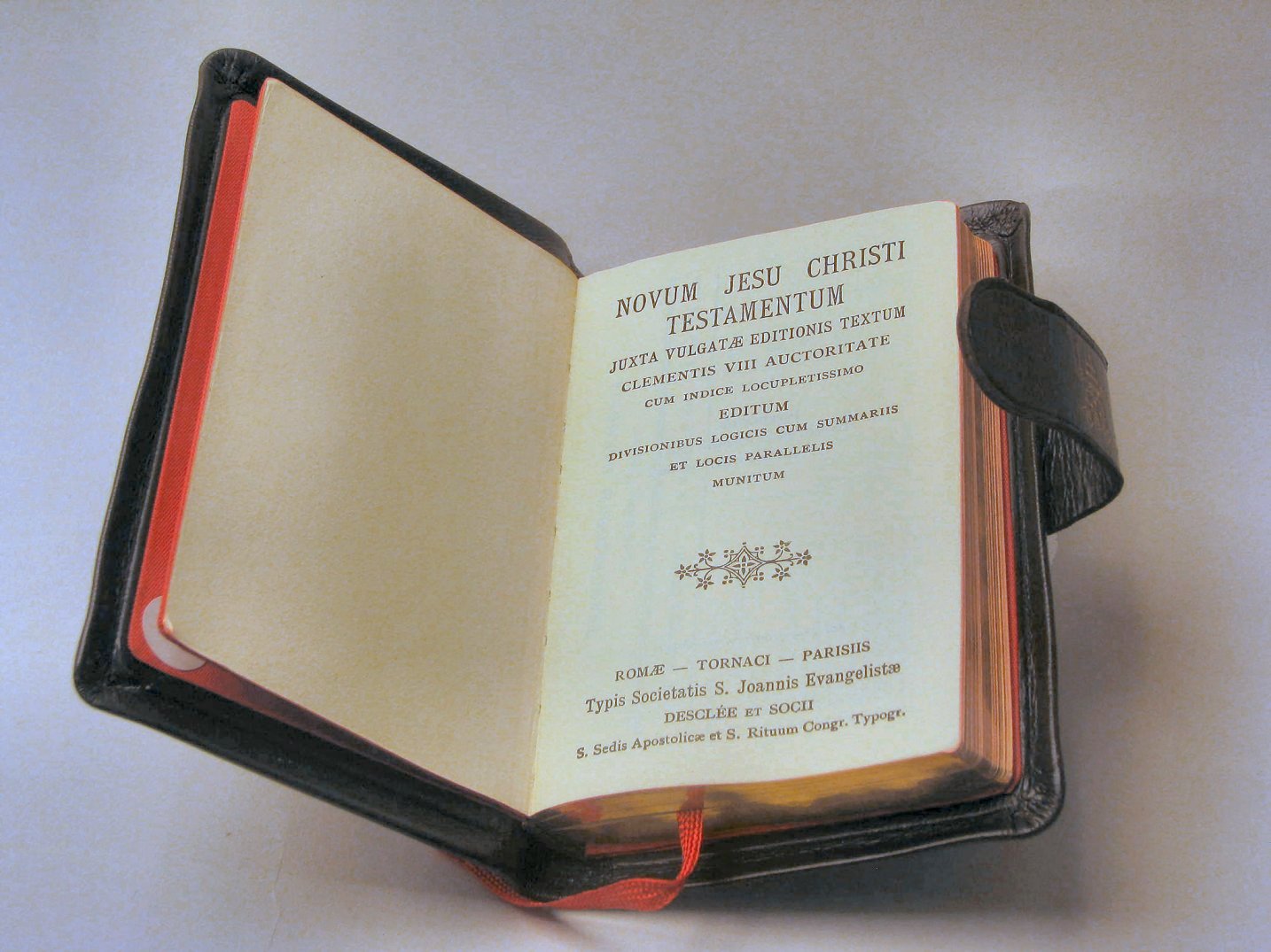 Nieuwe Testament met "Concilium Oecumenicum Vaticanum II", in bruin kartonnen doos
