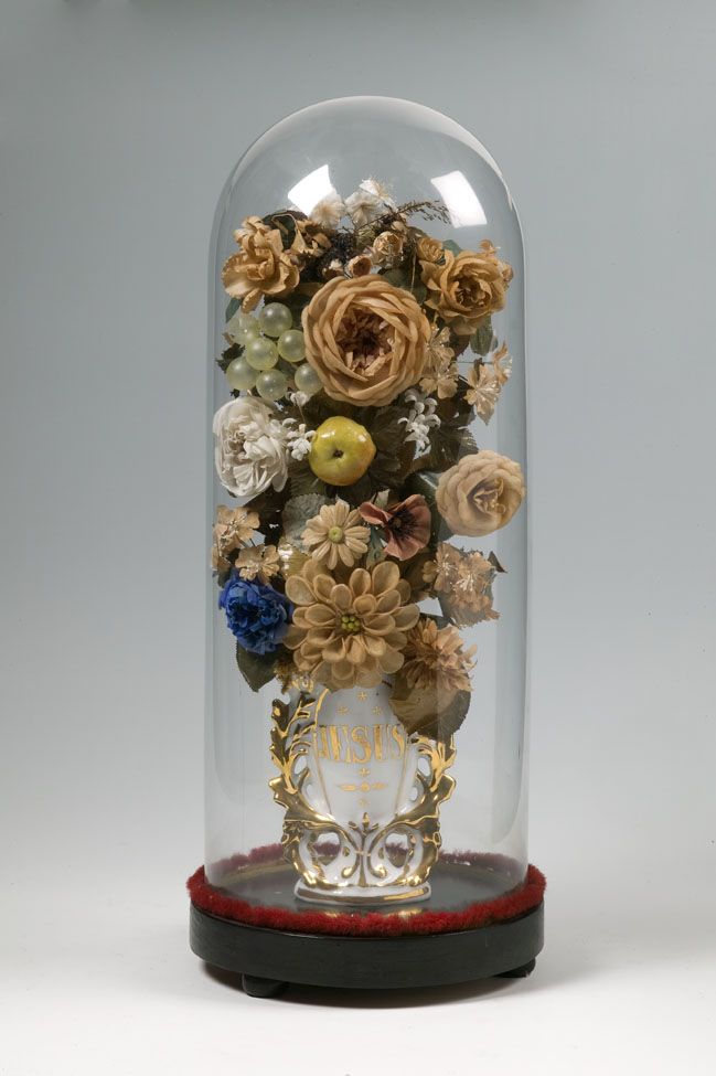 Vaas met "Jesus" met eromheen bloemen van textiel