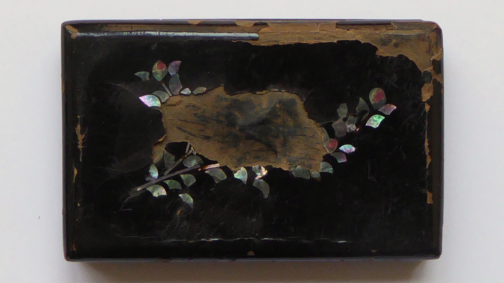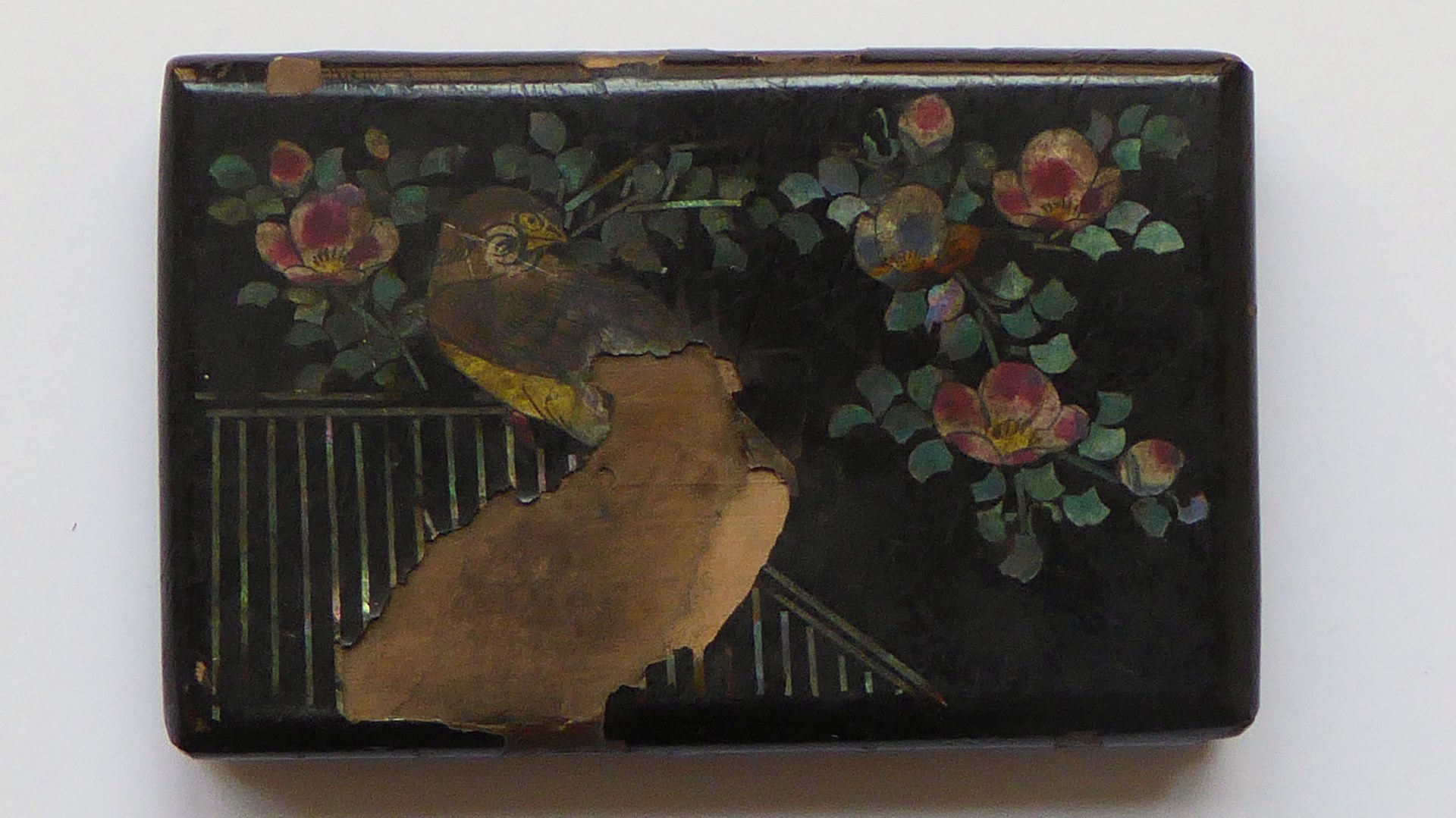 Rechthoekig doosje versierd met inlegwerk voorstellende een vogel en bloementakken