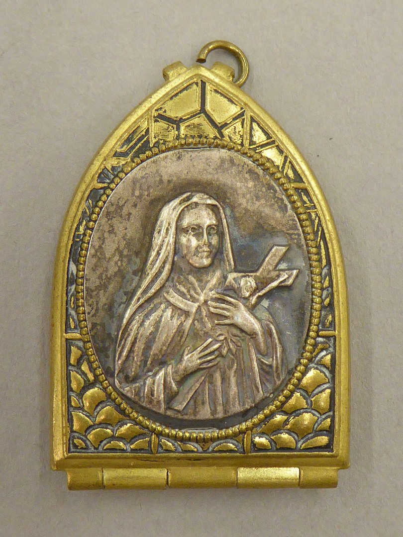 Hanger met H. Theresia waarin minirozenkrans met beige en witte kralen