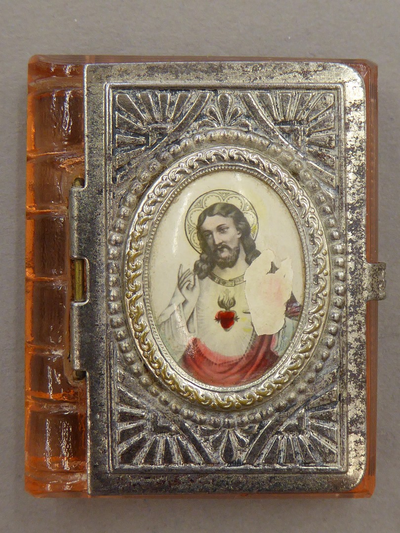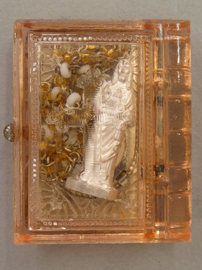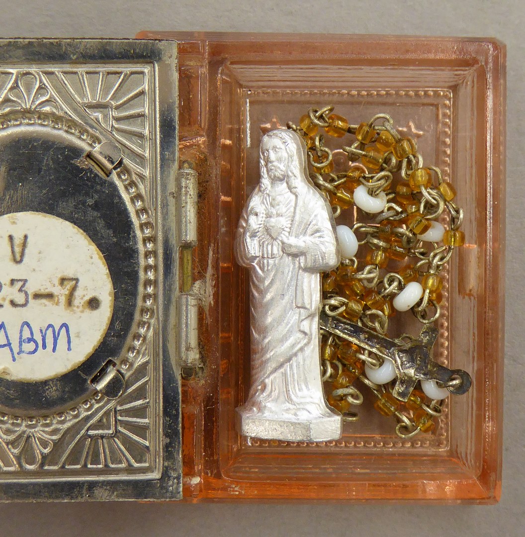 Glazen houdertje waarop medaillon met H. Hart Christus met minirozenkrans en H. Hartbeeldje