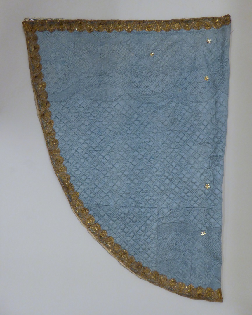 Blauwe doorgestikte mantel afgezet met goudkant, van staakmadonna