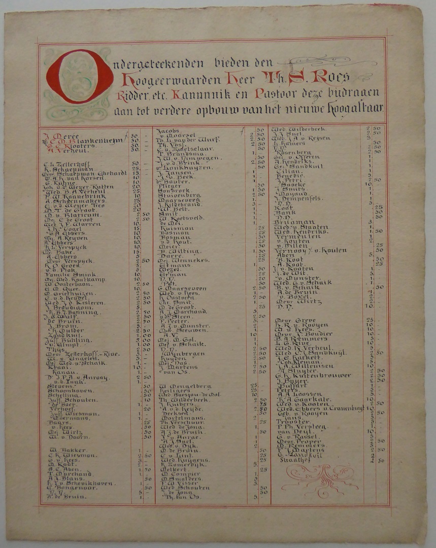 Plaat voor pastoor H.S. Roes: Namenlijst met "Ondergeteekenden bieden ... nieuwe hoogaltaar ..."