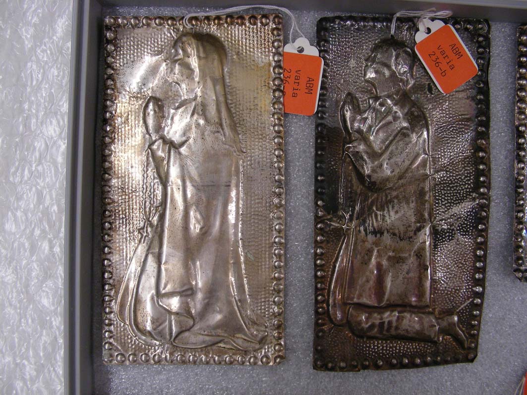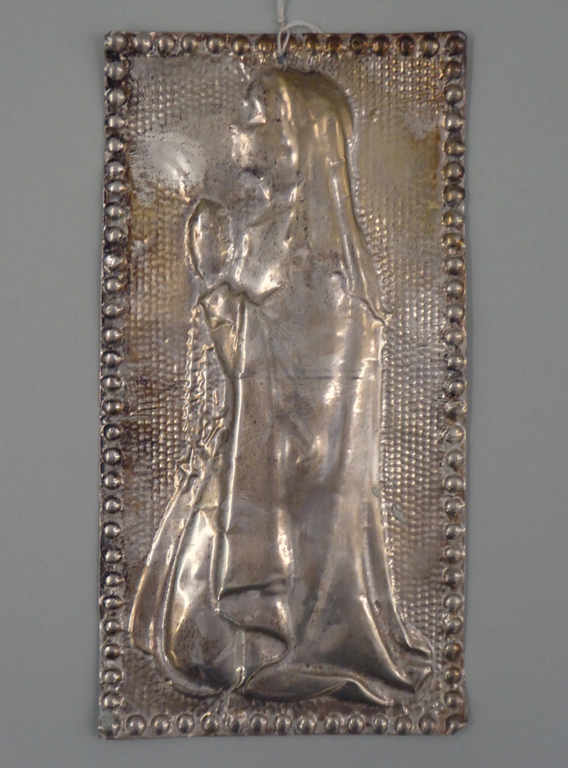 Ex-voto van bladzilver, biddende vrouw met rozenkrans