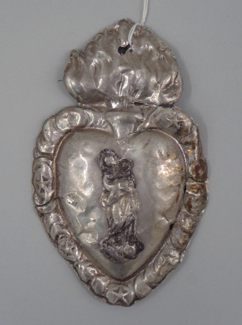 Ex-voto van bladzilver, H. Hart waarop Maria met kind
