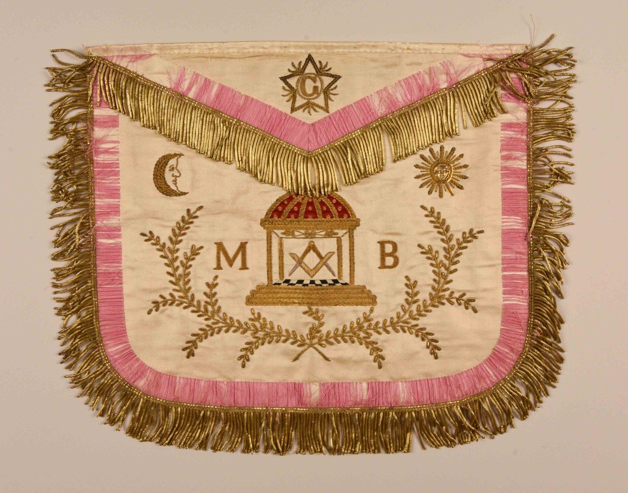 Wit meestersschootsvel geborduurd met vrijmetselaarssymbolen