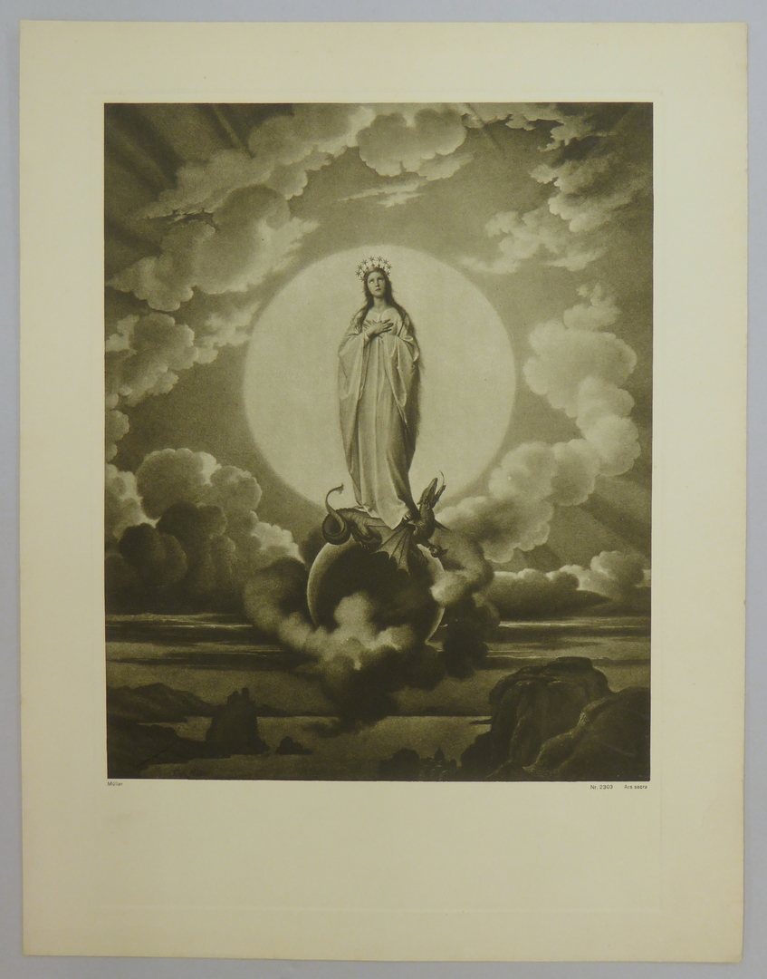 Prent met Maria staande op draak en wereldbol