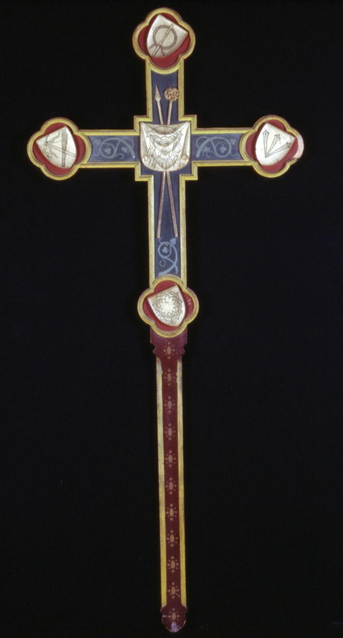 Passiekruis beschilderd met voorstellingen van de passiewerktuigen en op keerzijde symbolen van de evangelisten