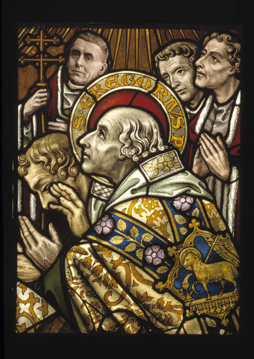 Fragment glasraam over de zeven sacramenten met Gregorius en pastoor Meuleman (Utrecht, O.L. Vrouw ten Hemelopnemingkerk)