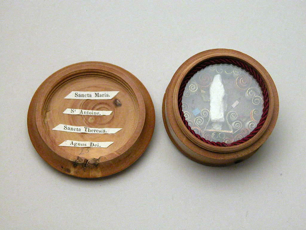 Rond heiligdommetje met drie relieken en heiligenbeeld