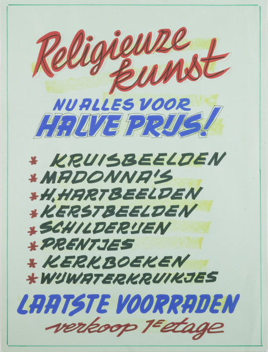 Affiche met "Religieuze kunst nu alles voor halve prijs! kruisbeelden, Madonna's, H. Hartbeelden, kerstbeelden, schilderijen, prentjes, kerkboeken, wijwaterkruikjes ..."