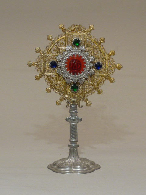 Speelgoedmonstrans met rood glas middenin waarom twee groene en blauwe steentjes