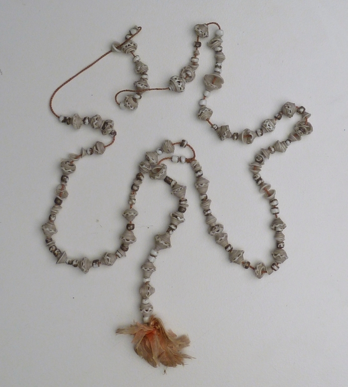 Rozenkrans met witte opengewerkte glazen kralen met aan uiteinde bloem van roze textiel