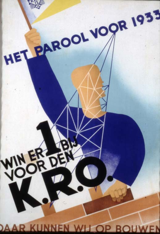 Affiche van de KRO met metselaar aan het werk, KRO-embleem en "Het parool voor 1933"