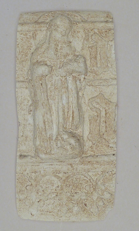 Afgietsel van reliëf met mannelijke heilige, van klok van de R.K. Christophoruskerk te Schagen, gegoten door Herman in 1478