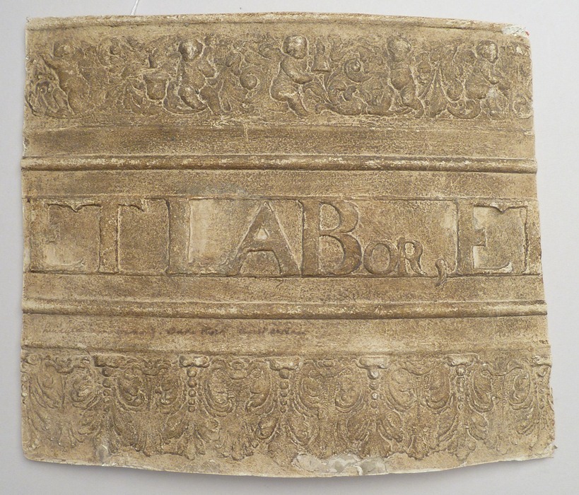 Afgietsel van reliëf met "et labor, et ...", van klok van Oude Kerk (H. Nicolaas) te Amsterdam, gegoten door François Hemony in 1659