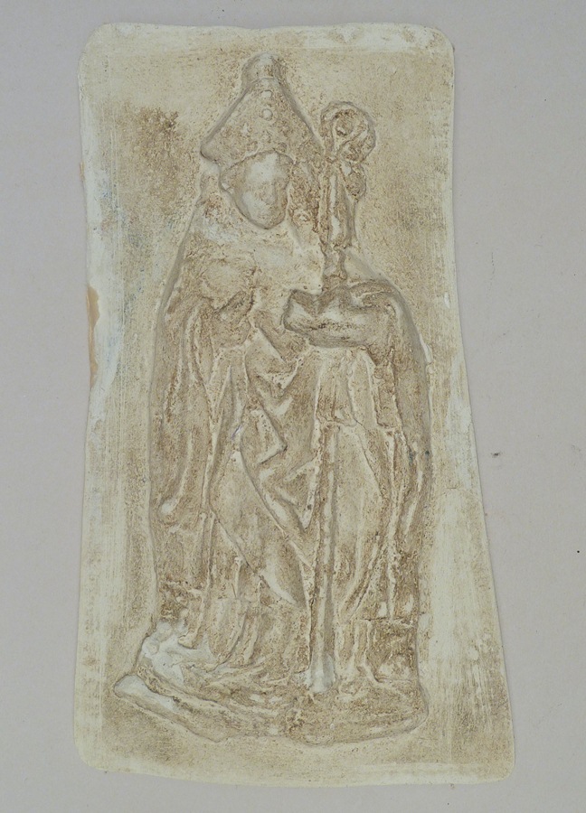 Afgietsel van reliëf met St. Nicolaas, van klok van N.H. kerk te Muiden, gegoten door Hendrik de Borch in 1525