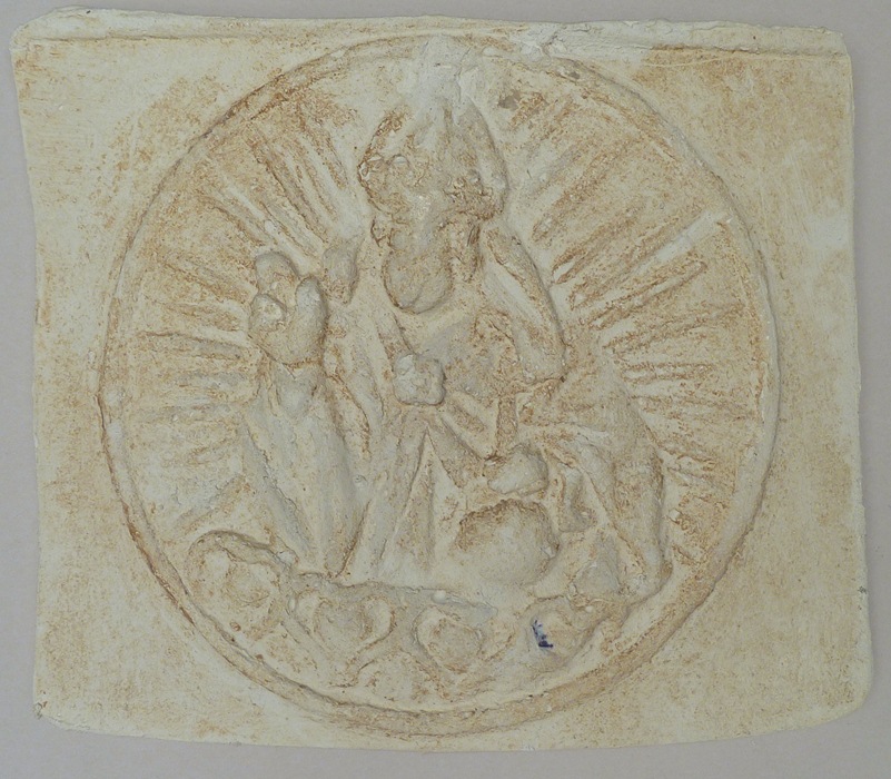 Afgietsel van reliëf met zegenende bisschop van klok van kerk