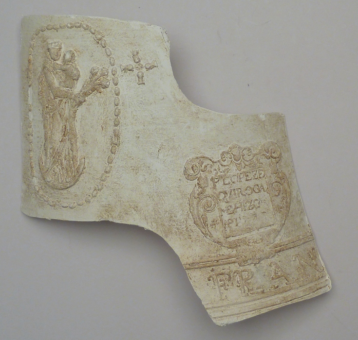 Afgietsel van reliëf met Maria met kind en tekstmedaillon met "P. Lopez Quiroga me hizo ...", van klok van N.H. kerk te Wieringerwaard, gegoten door Pedro Lopez de Quiroga